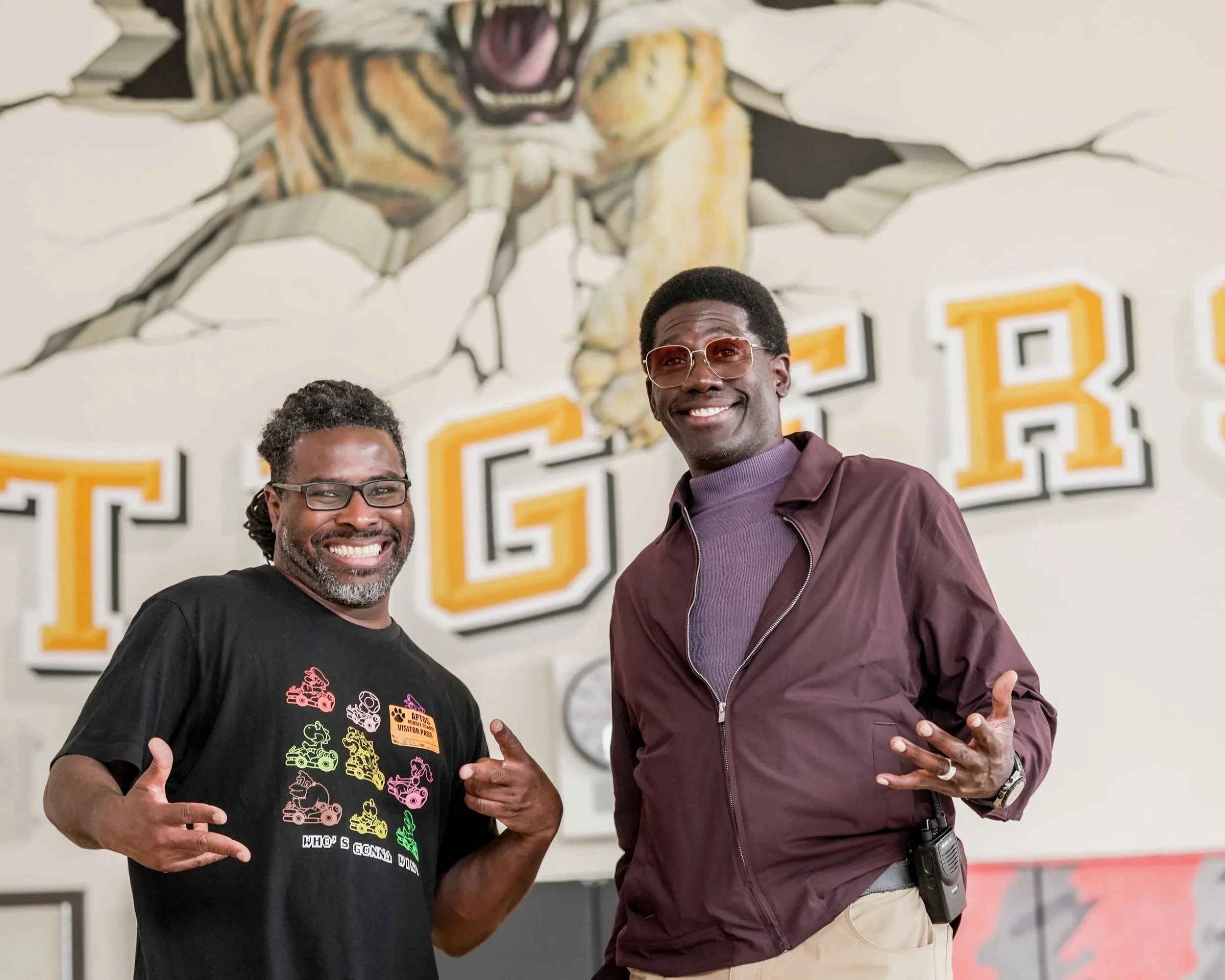 Clyde Evans, Jr., IMOD’s Director of GEP School Residency Program & Hip-Hop Dance (left) with Dimitric Roseboro, Principal of Aptos Middle School (San Francisco)